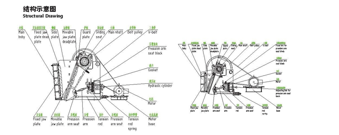 欧版颚式破碎机主要包括机座、定颚、动颚、偏心轴,定颚上固定有定颚齿板,动颚齿板通过连接栓杆固定在动颚上,动、定颚齿板的两侧设有侧护板,动颚的上端套装在偏心轴上,动颚与偏心轴间设有轴承室,其动颚齿板顶端高出定颚齿板约80-250mm。结构简单合理,高出的动颚齿板对动颚和轴承室有很好的?;ぷ饔茫直Vは铝铣┩ǎ苊馊峡ɑ窒螅踩煽浚⑶冶臼涤眯滦突辜蚧硕Φ闹谱鳎χ岢惺颐芊庑院茫诵行阅芎茫宦┯停纳屏苏褂们榭觯胍粜。诵衅轿?,节电节能效果明显,利于推广应用,广泛适用于矿山、建材、硅酸盐、冶金、筑路、化学工业原料等领域,特别适宜中等硬度料的粉碎,如岩石、矿石、水泥厂的熟料等。